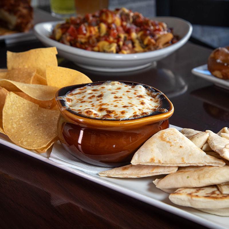 Spinach and artichokes in a house made cream cheese dip, served with warm pita and tortilla chips